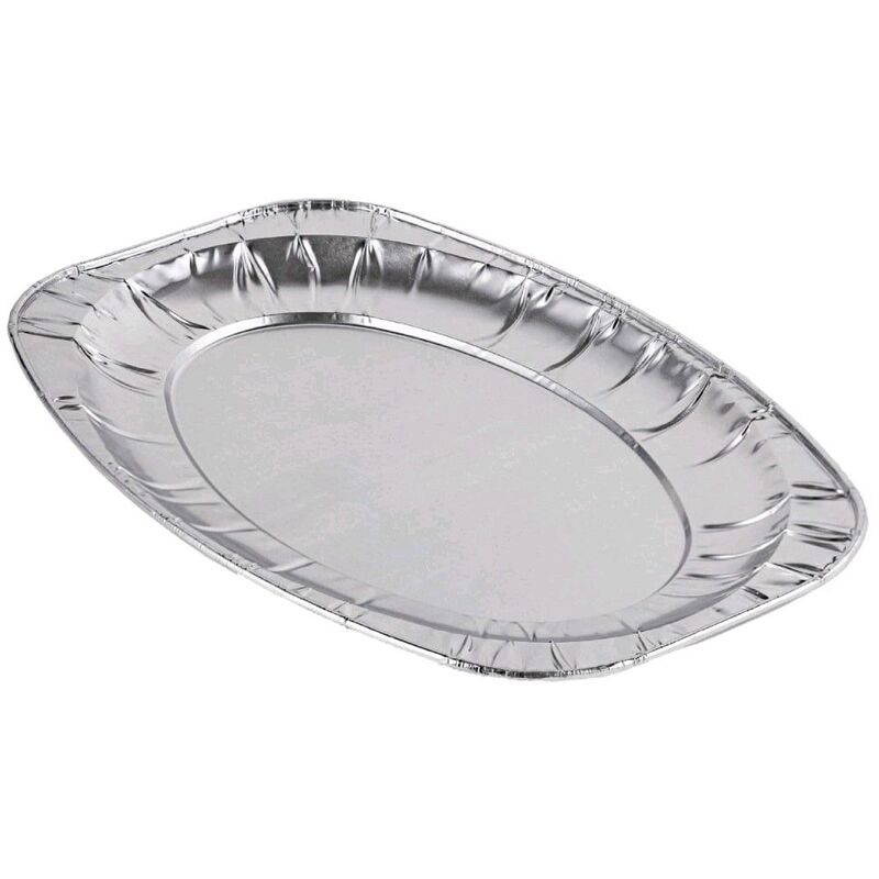 The Oval Aluminum Service Plate No. 6550 is a disposable serving platter designed for both commercial and personal use. Each carton contains 150 pieces, making it suitable for events, catering services, restaurants, and large gatherings. Key Features: Material: Aluminum Shape: Oval Dimensions: 252 mm (Length) x 176 mm (Width) x 15 mm (Height) Quantity per Carton: 150 pieces Product Benefits: Recyclable: The aluminum material is environmentally friendly and can be recycled after use. Refrigerator Safe: Suitable for storing food in refrigeration without compromising the platter's integrity. Food Grade: Manufactured to meet food safety standards, ensuring it's safe for direct contact with food items. Convenient and Lightweight: Easy to handle and transport, making it ideal for events and catering services.