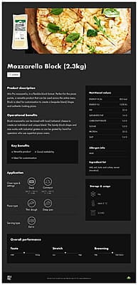 Arla Pro; made specifically with professional chefs & operators in mind. Arla Pro Mozzarella Block is high-quality mozzarella in a versatile easy handle block format that can be used across the menu, ideal for customisation to create a bespoke blend/shape and authentic and unique looking pizza. Can be mixed with local/artisanal cheeses to create an individual blend. Shape and size works with industrial graters to create a Napoli cut or can be grated by hand. A great choice for chefs looking for versatility and personalisation as well as flavour and functionality. For optimal results, we recommend a wood fired, traditional and stone ovens. A versatile product for usage across pizza, in paninis or spinkled on baked pasta dishes for a stretchy texture. Long shelf life on production. Farmer Owned and suitable for vegetarians.